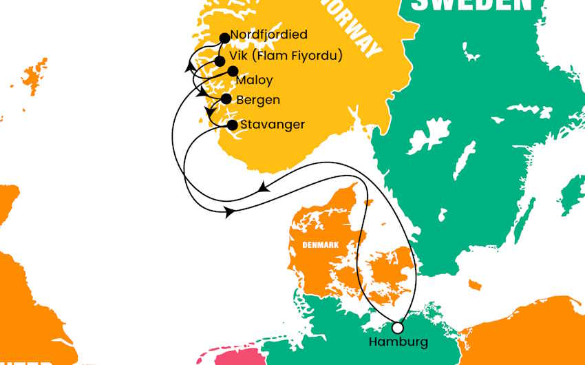 İzmir – Hamburg, Denizde Seyir, Maloy | Olden Brikstal Buzulu & Stryn Köyü, Nordfjordeid| Hornindal Gölü & Geiranger Fiyortu, VIK | Muhteşem Flam Fiyortu & Gudvangen & Tvinde Şelalesi, Bergen | Bergen Şehir Turu & Füniküler ile Floyen Tepesi, Stavanger | Utstein Abbey Manastırı & Üç Kılıç Anıtı & Stavanger Şehir turu, Denizde Seyir, Hamburg – İstanbul ziyareti
