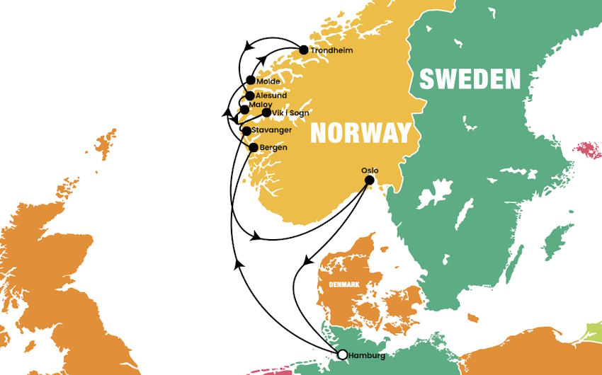 İstanbul - Hamburg, Denizde Seyir, Bergen | Bergen Şehir Turu & Füniküler ile Floyen Tepesi, Molde | Molde Şehir Turu & Kuzey Atlantik Yolu, Trondheim | Trondheim Şehir Turu & Sverresborg Açık Hava Müzesi, Alesund | Trollstiegen Şeytan Yolu & Alesund Şehir Turu, Maloy | Olden Brikstal Buzulu & Stryn Köyü, Vik-i SOGN | Muhteşem Flam Fiyortu & Gudvangen & Tvinde Şelalesi, Stavanger | Utstein Abbey Manastırı & Üç Kılıç Anıtı & Stavanger Şehir turu, Oslo | Oslo Şehir Turu, Oslo | Oslo Şehir Turu, Denizde Seyir, Denizde Seyir, Hamburg – İstanbul | Hamburg Şehir Turu Seyir ziyareti