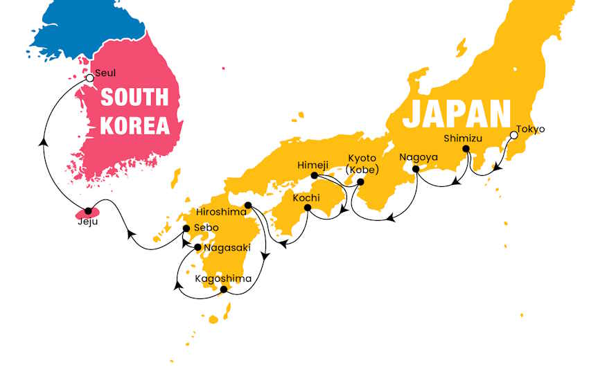 İstanbul – Tokyo, Tokyo| Panoramik Tokyo Şehir Turu & Otel’e transfer, Tokyo| Tokyo Şehir Turu, Tokyo | NCL SPIRIT’e transfer, Mount Fuji Shimizu | Ashi Gölü & Fuji Manzaralı Kasabalar Turu, Nagoya | Nagoya Kalesi & Honmaru Sarayı Turu, Kyoto | Kyoto Turu, Himeji| Himeji Kalesi & 14. YY Japonyasına Yolculuk, Kochi | Kochi Castle & Kochi Şehir Turu, Hiroshima | Itsukushima Tapınağı & Hiroşima Şehir Turu, Kagoshima| Kagoshima Şehir Turu, Nagasaki| Nagasaki Şehir Turu, Nagasaki (Sasebo) | Sasebo Adası ve Tekne Turu, Jeju | Yakcheonsa Tapınağı & Yeomiji Botanik Bahçeleri & Cheonjeyeon Şelalesi, Seul - İstanbul | Seul Şehir Turu ziyareti