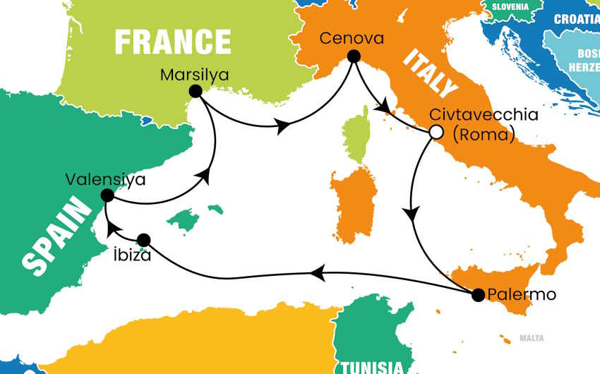 İstanbul – Roma - Civitavecchia, Palermo | Cefalu & Palermo Turu, Denizde Seyir, İbiza, Valensiya | Valensiya Şehir Turu, Marsilya | Aix-En Provience & Marsilya Şehir Turu, Cenova | Portofino & Cenova Turu, Civitavecchia – Roma - İstanbul ziyareti