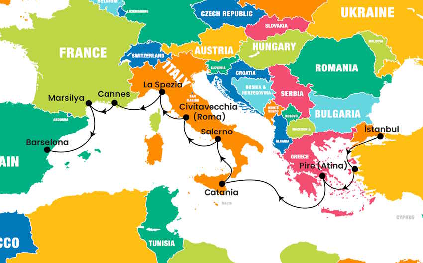 İstanbul, Kuşadası, Pire (Atina) | Atina Şehir Turu, Denizde Seyir, Catania | Etna & Savoca & Taormina, Salerno | Salerno Turu, Civitavecchia (Roma) | Roma Şehir Turu, La Spezia | Floransa & Pisa, Cannes (Côte d'Azur) | Monte Carlo Turu & Cannes, Marsilya | Aix-En Provience & Marsilya Şehir Turu, Barselona – İstanbul ziyareti
