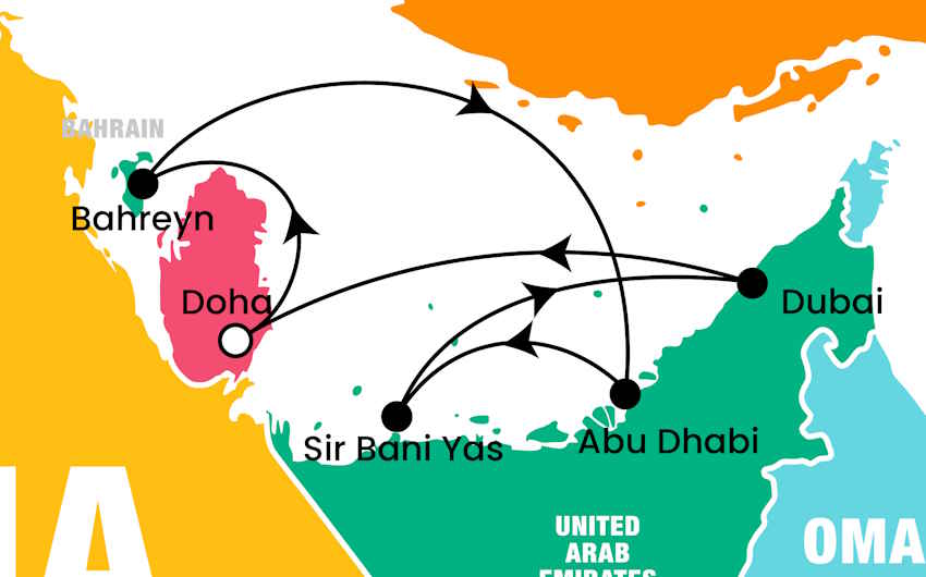 İstanbul – Doha, Bahreyn|Bahreyn Şehir Turu, Denizde Seyir, Abu Dhabi |Abu Dhabi Şehir Turu, Sir Bani Yas, Dubai | Dubai Şehir Turu & Akşam Yemekli Çöl Safari Turu, Dubai | Dubai Mall ve Emirates Mall Turu, Doha - İstanbul ziyareti